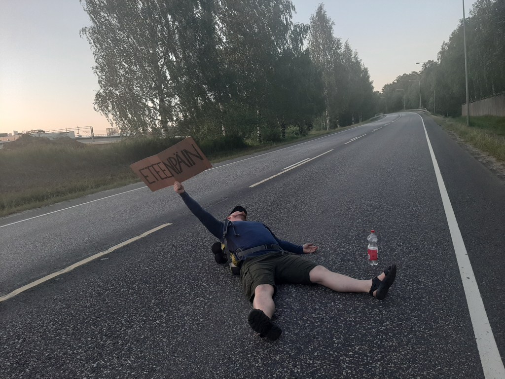 The next THREE hours or so, we were waiting for the very few cars still on the move while walking several kilometres forward. My feet were hurting and so was my burned skin. There was even a guy who joined the hype train on his way home from pub when he noticed our cardboard. Eventually a quiet Estonian guy picked us up out of pity and took us 15 kilometres down the road.