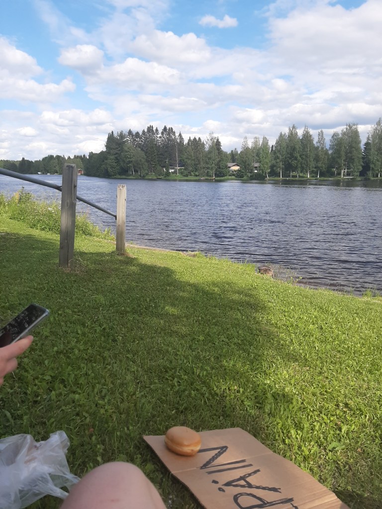 We went to Kajaani marketplace for some absolutely comforting bagel and coffee breakfast. Afterwards our friends drove us out of the city to charge our phones and ourselves at a gas station before hitting the road. It took us a while in an air conditioned room to gain spirit for the following.