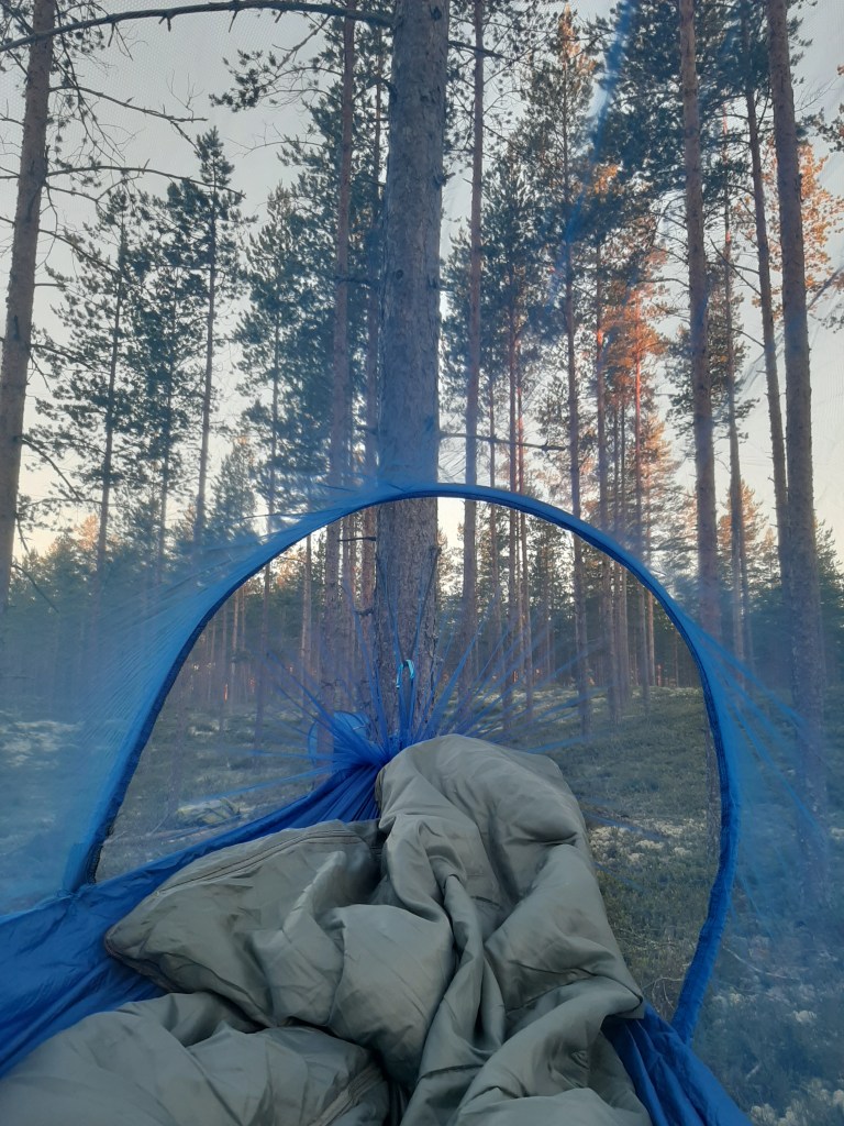 First night in a hammock was a great lesson in physics. It became evident that when you lie down, you are pressed so firmly on the fabric that it doesn’t insulate any air at all. The surprising coldness kept me awake in my thin sleeping bag throughout the night. Do get yourself proper equipment or a ton of clothes if you ever consider spending a night in a hammock.